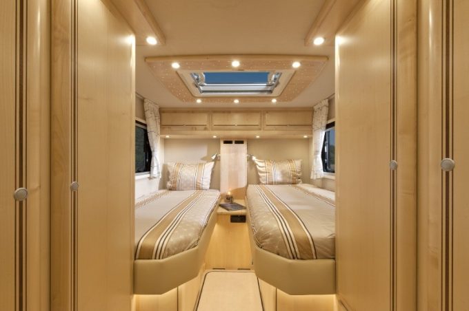 Notez que si toutes les implantations sont réalisées à la demande, elles ont en commun le nouveau mobilier ''Intarsia'' avec des meubles recouverts d'érable à l’aspect plus lumineux et au design légèrement plus arrondi. Les lits jumeaux à l'arrière, les nombreux et vastes rangements, la salle d'eau spécifique ainsi que le vaste salon (avec un slide out à gauche) signent l’ultra-confort du modèle.