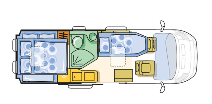 Développé sur un Fiat Ducato long et reprenant une implantation classique, avec bloc cuisine latéral et salle d'eau centrale, le SHX adopte en revanche une implantation originale pour coucher jusqu'à cinq personnes (grâce à un lit d'appoint côté dinette). Son lit arrière double, positionné transversalement, est surmonté d'un lit de pavillon (double lui aussi) placé longitudinalement. Dans la journée, ce couchage se replie en un tournemain au plafond. De quoi dégager un maximum de place dans le salon et disposer de nombreux rangements hauts.