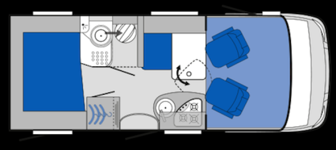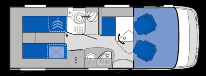Les nouveaux intégraux du constructeur allemand, présentés au Caravan Salon de Düsseldorf 2012, portent désormais le nom de Van en raison de leur gabarit plus étroit. Avec 14 cm de moins en largeur (soit 2,20 m) par rapport aux intégraux Knaus Sky I, une ligne plus dynamique et un grand pare-brise remontant haut, le Knaus Van I s'avère aussi moins lourd. Ceci profite autant à la maniabilité qu'à la charge utile. Et tout cela sans trop pénaliser le confort à bord puisque le lit de pavillon affiche des cotes de 185x150 cm. Ce modèle, long de 6,72 m et haut de 2,72 m, sera proposé avec trois implantations différentes (voir ci-dessous).