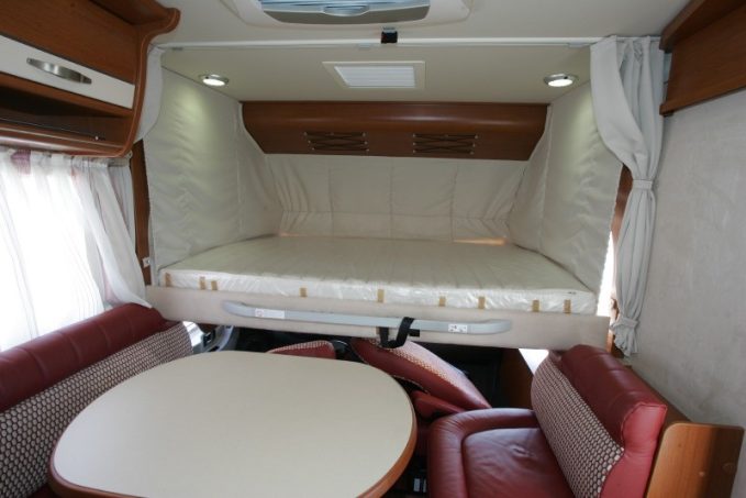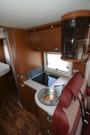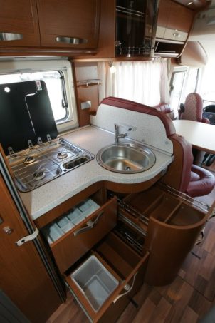 Et aussi : le plan de l’intégral B 598, a tellement séduit, qu’il se retrouve désormais dans un profilé : le Hymer Tramp 598. Celui-ci est reconnaissable à son living, sa grande cuisine en L face au réfrigérateur de 150 litres et surtout à sa chambre avec lit central.