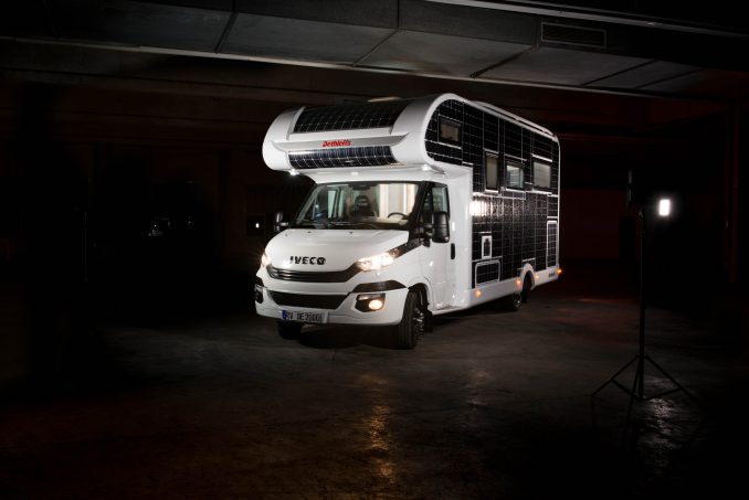 Sur une base de capucine Globetrotter XXL, Dethleffs a tapissé toit, parois, face arrière et même l’arrondi de capucine de panneaux solaires (recouverts d’une fine couche de plexi pour protection).