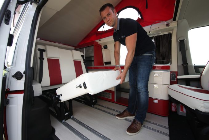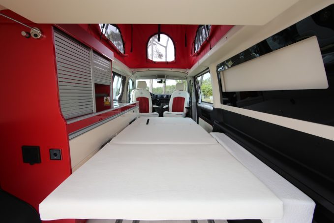 L’ADN Westfalia se retrouve complètement à bord. La sellerie et le mobilier rouge et blanc génère une belle ambiance rétro, unique en son genre. L’implantation est celle du California (banquette double convertible et bloc cuisine latéral). Un couchage est intégré sous le toit relevable dont la toile parée de rouge s’harmonise avec les couleurs de la carrosserie. Le Sixty vient donc en complément des Kepler One et Six.