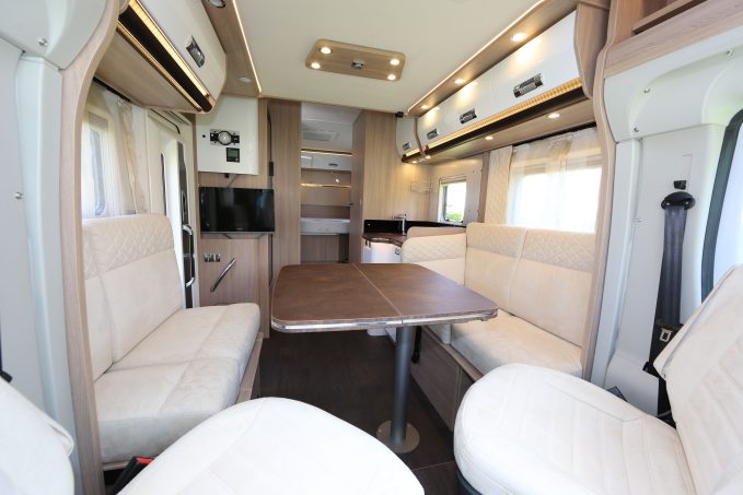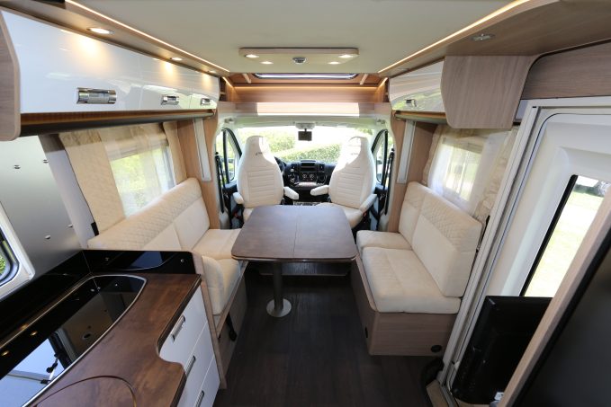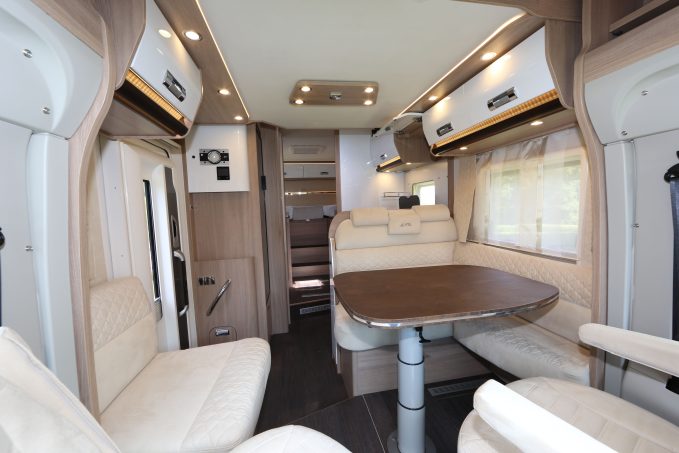 Nous avons notamment les Kosmo 512 et 212, tous deux pourvus d’un lit central. Long de 7,40 m, le modèle 512 reçoit en plus un salon lounge avec banquettes latérales en vis-à-vis, convertibles en sièges face route (cela va de soi !). Le Kosmo 212 qui ne sera visible pour la première fois qu’au salon du Bourget est quant à lui un profilé compact (6,95 m) avec petit salon doté d’une banquette en L et d’un strapontin sur la droite.