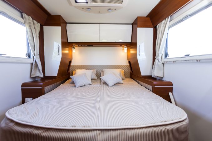 En bout arrière, la chambre accueille un lit central de 160 cm de large et 198 cm de long. Le confort est optimal : matelas Bultex haute-résilience associé à un sur-matelas, le tout pour une épaisseur totale de 15,5 cm. Le sommier se règle électriquement en hauteur (plus ou moins 30 cm). Idem pour les têtes de lit indépendantes.
