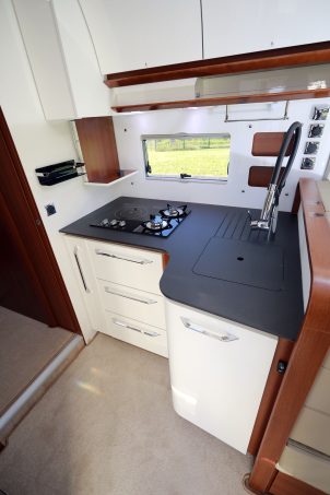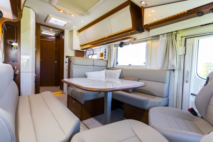 La porte d’entrée de 62,5 cm de large, facilite la montée à bord. Le seuil franchi, on arrive dans le salon, lequel est composé d’une banquette en L, d’un divan latéral et d’une grande table.