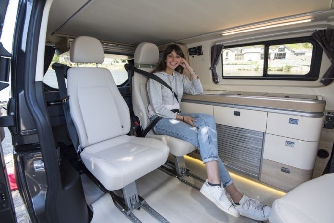 Se prêtant particulièrement bien à un aménagement à toit relevable, le Transit Custom se décline en deux longueurs : 4,97 et 5,34 m. Comme son grand frère, il s’affiche à un tarif intéressant tout en disposant des mêmes mécaniques : un 2.0 TDCi avec injection d’AdBlue de 105, 130 ou 170 ch. Restylé au courant de l’année dernière, principalement à l’intérieur avec une planche de bord revue, il a encore gagné en personnalité et offre un ensemble très inspiré des voitures particulières avec une présentation soignée, un confort de suspension appréciable et une insonorisation satisfaisante. Il peut s’envisager comme un véhicule de tous les jours et ses qualités ont séduit deux marques spécialistes du fourgon aménagé du groupe Rapido.