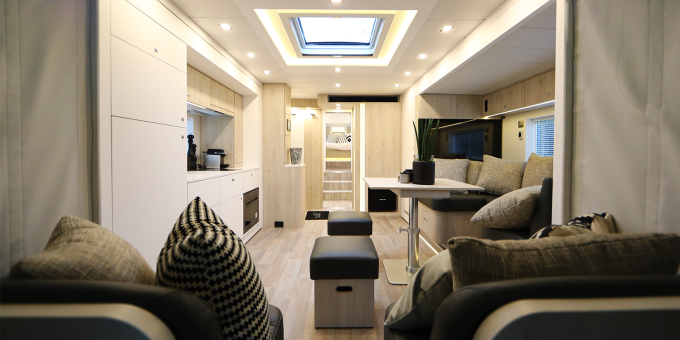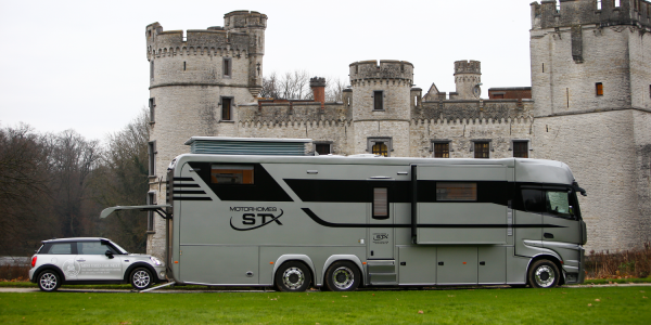 La société belge Stephex, qui faisait fureur dans le transport de chevaux, a décidé de se spécialiser dans le domaine des camping-cars poids lourds sur-mesure. Le modèle STX 2 pop-outs & garage arbore un look plus liner que camion. La cabine se veut en effet parfaitement intégrée à la cellule, tandis que quatre « slide out », à commande électrique, permettent d’augmenter la surface et le volume de l’habitacle. Un large panels d’équipements sont à votre disposition. Le prix du véhicule débute à 700 000 € et varie en fonction des options.