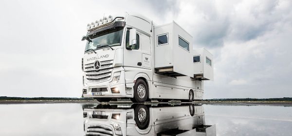 L'Actros est le véhicule idéal pour les voyages long-courriers. Le fleuron de Mercedes-Benz Trucks permet une conduite sereine et séduit par un confort et une sécurité exemplaires. Autant de raisons qui ont amené le constructeur de camping-cars MAGELLANO à utiliser l'Actros comme base pour un modèle qui ne manquera pas d'attirer tous les regards. Il mesure 10,60 mètres de long, 3,99 mètres de haut et 2,50 mètres de large. À l'arrière, la superstructure abrite un garage. Un générateur diesel vient compléter l'OM 471 de 310 kW présent à bord. Le réservoir d'eau fraîche peut contenir 750 litres C’est en voyant l’intérieur du véhicule que le terme luxe prend tout son sens, le véhicule est équipé de deux téléviseurs, système de sonorisation, installation satellite et accès Internet…Ce modèle est disponible à partir de 700 000 €.