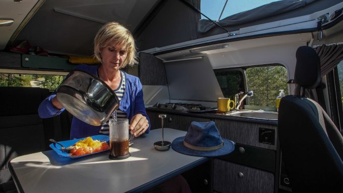 Le meuble, fixé sur le flanc gauche, accueille un évier, un réchaud à gaz deux feux et différents rangements (dont un pour le WC portatif). Un réfrigérateur de 30 litres trouve sa place dans un tiroir sous la banquette. La table de salon (80 x 50 cm), démontable en un clin d’œil, peut se ranger dans le coffre.