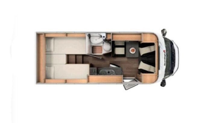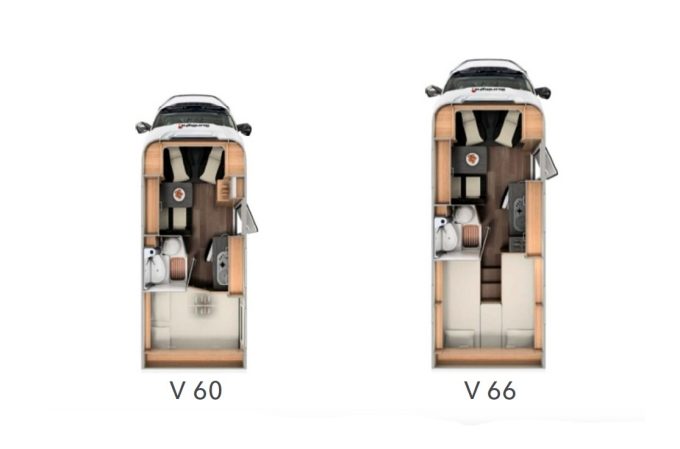 Le V 60 dispose d’un lit transversal à l’arrière aux dimensions de 194 x 130/140 cm et s’affiche à 39 290 €. Quant au V 66, il propose des lits jumeaux, une salle d’eau « Vario » et un réservoir d’eau de 116 l. Le V 66 est commercialisé à partir de 41 990 €.