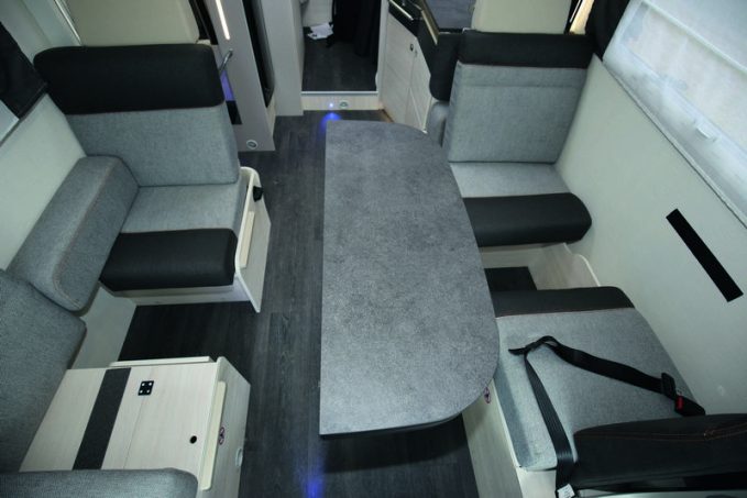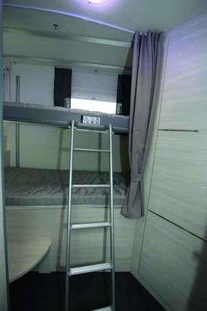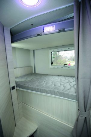 La partie arrière est également très intéressante. Le Quartz 380 hérite de l’Easy Box, le système de coffre modulable en hauteur, exploité sur le Genesis 274 (lancé au printemps). Ce dispositif a pourtant été revisité. On le retrouve recouvert d’un matelas, lui-même surmonté d’un lit de pavillon. L’endroit peut alors se transformer en chambre d’enfants à lits superposés. La modularité est stupéfiante, voire amusante. Le Quartz 380, qui mesure 7,20 m en longueur, est bridé sur le châssis cabine du Ford Transit animé par une motorisation de 170 ch + boîte mécanique.