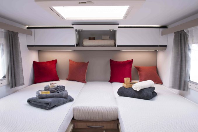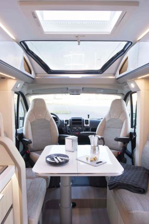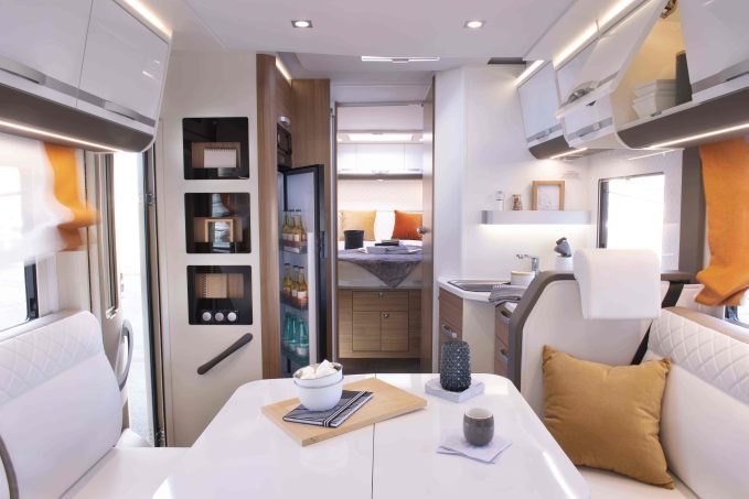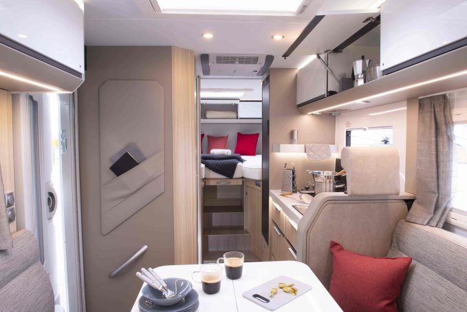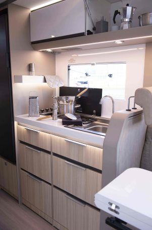 Autre grande nouveauté: le retour au catalogue d’un profilé à cellule étroite (2,12 m). Le « Compact DL », long de 6,99 m, est pourvu d’un salon lounge où quatre personnes peuvent prendre place. La cuisine est un splendide bloc très bien pensé, qui compte de multiples rangements, une plaque de cuisson en ligne (les trois feux sont exploitables) et un plan de travail. Un réfrigérateur étroit de 152 litres se trouve dans le prolongement du meuble.