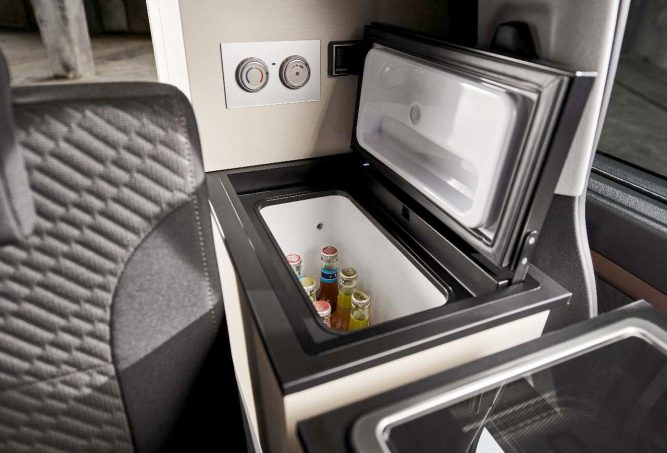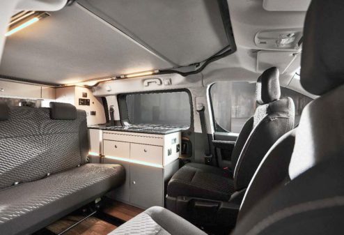 CrossCamp lance donc un modèle d'une longueur de 4,95 m pour 1,99 m de haut. A bord, l'ambiance est soignée et l'agencement relativement conventionnel sur ce type de modèle. On trouve une kitchenette placée derrière le siège conducteur, qui a la particularité d'être amovible. Cette cuisine profite d'un mini-réchaud, d'un évier, d'un réfrigérateur à compression et de divers rangements. De série, le modèle devrait être livré avec une banquette coulissante deux places, transformable en couchage. En option, il sera possible d'y installer une rangée supplémentaire. Elle se destine à 3 personnes et autorise un usage à 7. Le CrossCamp joue donc la carte de la polyvalence entre monospace et véhicule de loisirs... Au point de rappeler sous bien des aspects, le Campster (Citroën).