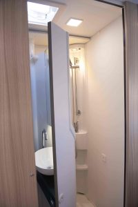 Face au réfrigérateur, se trouve la salle d’eau duplex. Le simple fait de pivoter une paroi articulée transforme à l’envi cet espace en cabinet de toilette ou en cabine de douche. Une astuce qui permet d’occuper peu de place sans perdre en confort.