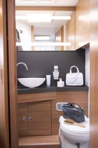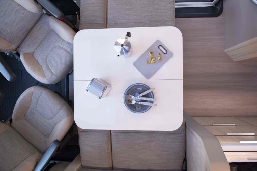 Les profilés Adria Matrix se caractérisent par la présence d’un lit de pavillon. Mais le Matrix 670 DC GT Edition a bien d’autres atouts. L’implantation correspond parfaitement aux attentes des camping-caristes français. On profite, à bord, d’un très joli salon lounge formé de deux banquettes latérales et des deux sièges de cabine pivotants. Ces confortables assises encadrent une vaste table pour dresser six couverts. Un salon où la convivialité est de mise. Les banquettes sont habillées de belles housses crème et beige.