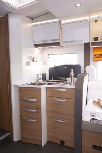 La cuisine se compose de tous les éléments nécessaires à la réalisation des repas. Le meuble principal aux lignes pures, compte plusieurs rangements pratiques. Ce bloc-cuisine se prolonge vers l’arrière par une colonne intégrant un grand réfrigérateur (152 litres) à sélection automatique d’énergie.