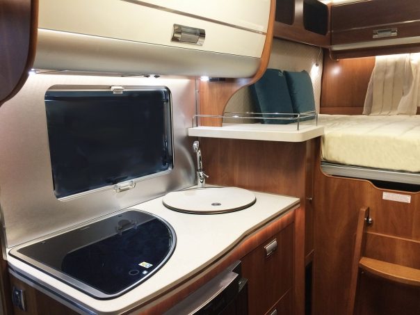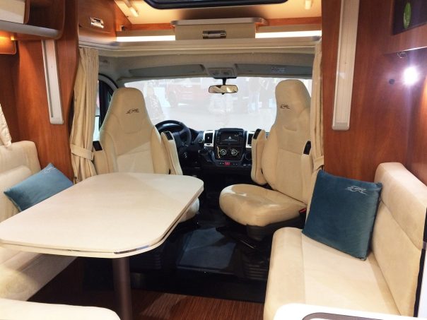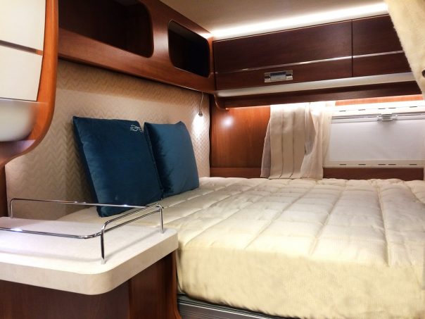 L’Ecovip 310 est un véhicule de 6,59 m de longueur. Pour ce 55e anniversaire, il se pare d’une décoration de carrosserie spécifique. A son bord, la compacité a poussé Laika à intégrer un lit double transversal (215 x 150/136 cm). Ce couchage est logé sur la soute garage. Le salon, pour sa part, dispose d’une banquette en L et d’un sofa latéral. Ces deux assises ceinturent la table multidirectionnelle bien dimensionnée. Côté ambiance, le tissu Pavia peut être associé au choix entre le mobilier classique Noyer Italien ou au plus moderne Poirier Toscan.