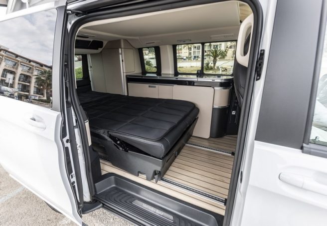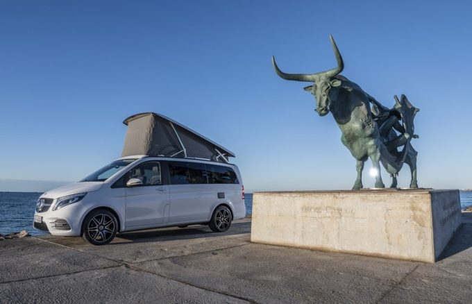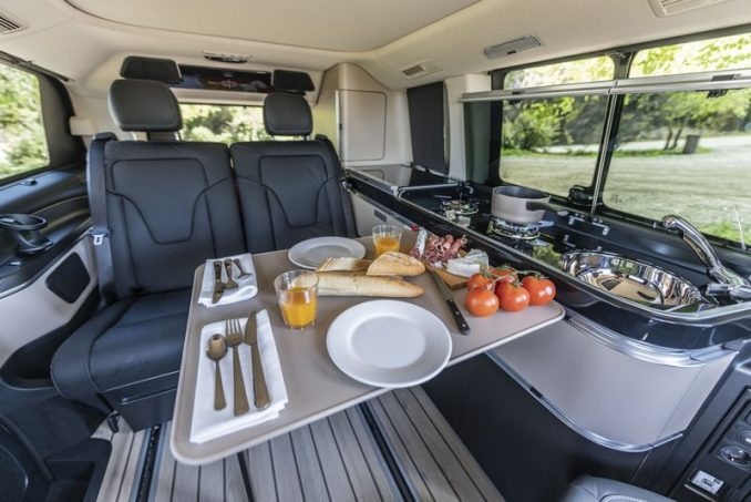 Enfin dans l’aménagement du Marco Polo, assuré par Westfalia, on retrouve le très beau bloc-cuisine avec ses deux tiroirs, d'un réchaud deux feux, l’évier et la glacière de 40 l. La confortable banquette arrière, une fois convertie, offre un couchage de 2,03 x 1,13 m. Il est complété par un lit double sous le toit relevable (en mode électrique sur option). Ce dernier bénéficie d’une toile isolante, sans pont thermique. Mercedes propose également sur option un ensemble de camping comprenant deux chaises et une table extérieures. Question autonomie, le Marco Polo dispose d’un réservoir d’eau propre de 38 l et d’un autre pour les eaux usées de 40 l. Quant au prix, les Marco Polo dans la base du nouveau Classe V, sont commercialisés, hors option, à partir de 50 304 €. Ils sont disponibles à la commande depuis le mois de mars et seront livrés à partir de cet été.