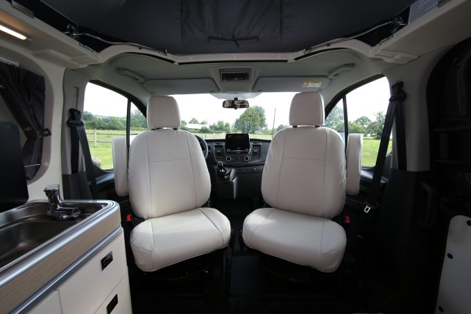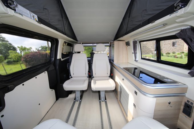 Le Ford Transit Custom aménagé par Campérêve se montre plus proche d’un monospace que d’un utilitaire, aussi bien en termes de design que dans son équipement intérieur. L’habitacle est modulable, ce qui offre la possibilité de disposer de deux paires de sièges indépendants ajoutés en deuxième et troisième rangées.