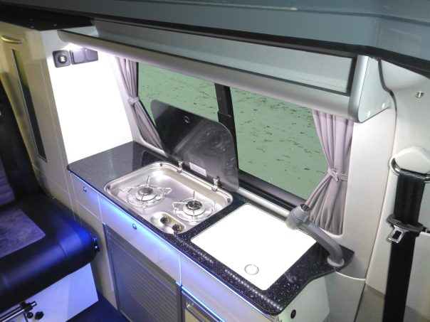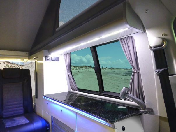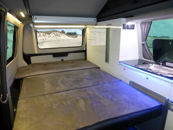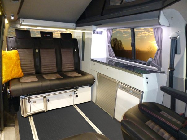 Distribué en France par la société toulousaine Eco Campers, l’aménageur allemand Reimo Van Concept dispose d’un catalogue riche et varié. Tous les modèles Reimo ne sont pourtant pas tous commercialisés dans l’Hexagone. L’offre se concentre avant tout sur des véhicules phares sur Volkswagen comme le best-seller, le Trio Style. En effet, l’agencement connu et maîtrisé par la marque présente des arguments de fabrication et d’équipements intéressants. Reimo a été le premier à disposer d’une banquette coulissante sur rails homologuée baptisée VarioTech. Elle est donc logiquement utilisée dans ce Trio Style. Elle se transforme très facilement en un vaste couchage double relativement plat de 130 x 200 cm. Une fois en place, le lit n’affecte en rien l’accès aux différents rangements (penderie, lingère, tiroirs de cuisine…). La cuisine présente un aspect esthétique mais surtout elle se révèle fonctionnel avec une équipement complet : réchaud 2 feux, frigo à compression de 40 l et cuve inox. Le réservoir d’eau propre contient 24 l et 27 l pour les eaux propre et usées. Il faut également souligner que cet aménagement se distingue par une table de salon bénéficiant d’un pied déporté intégré à cette banquette. Cette disposition permet de libérer tous l’espace au sol pour un plus grand confort des passagers. Un second couchage trouve sa place dans le pavillon avec un toit relevable. Les cotes du sommier sont de 125 x 195 cm. Tout est conçu avec des matériaux de qualité. Ce véhicule est disponible sur une longueur de 4,89 m mais peut être intégré dans une base longue de 5,29 m (3272 € supplémentaires). Côté tarif, il faudra débourser un peu plus de 61 680 € de base avec la motorisation 2.0 l Tdi de 150 ch.