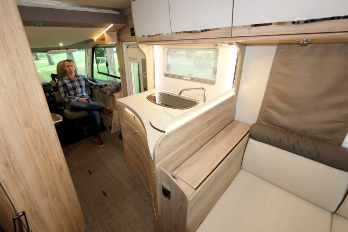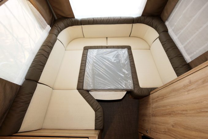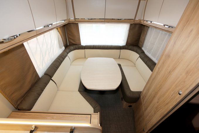 Malgré une longueur contenue, ce camping-car propose un maximum de confort à bord grâce à une implantation originale qui exploite toute la partie arrière pour disposer d'une dînette presque circulaire. Pour cela, elle fait appel à deux banquettes longitudinales (2,20 m et 1,43 m de long) encadrant une large banquette transversale (2,17 m) capable d'accueillir deux passagers (en option) pour voyager à quatre (ancrages des ceintures situés sur les parois intérieures). Le tout confère un espace convivial pour cinq ou six personnes et peut, au besoin, se transformer en couchage double. Il suffit pour cela d'abaisser le pied de la table centrale et d'y poser un matelas d'appoint.