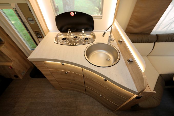 Le coin cuisine (dotée d'un réfrigérateur de 140 l) trouve sa place au centre tout comme le cabinet de toilette (doté d'un lavabo pivotant pour faciliter l'utilisation de la douche). La partie avant comprend une seconde penderie ainsi qu'un plateau de table rabattable. Le dessus de la cabine dissimule un lit de pavillon abaissable facilement à la main mais accessible uniquement à l'aide d'une échelle.
