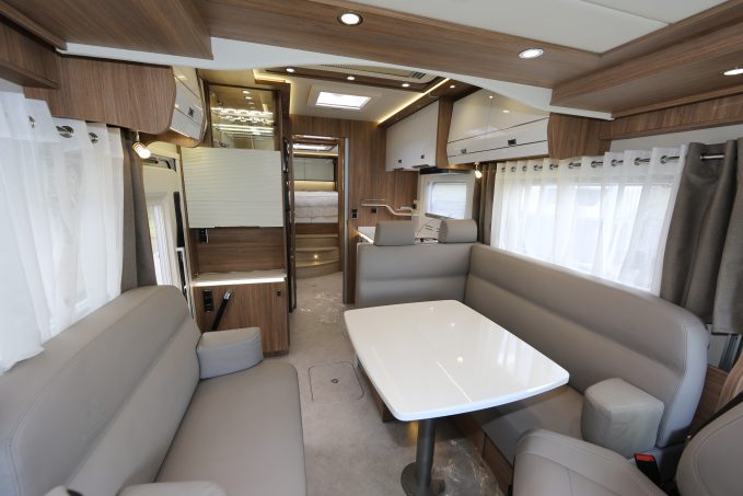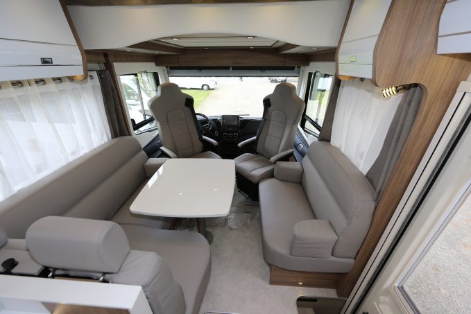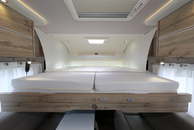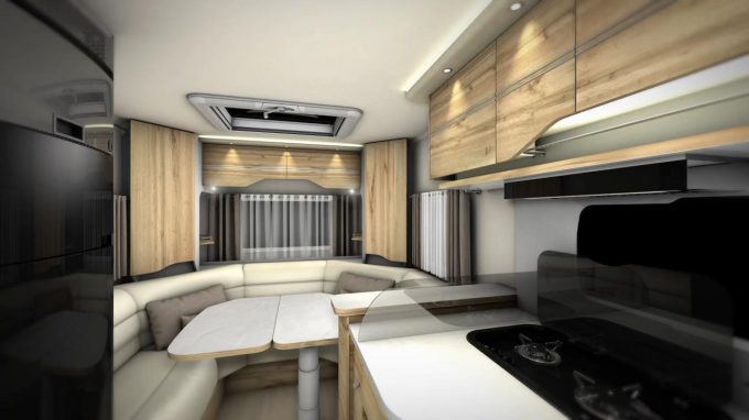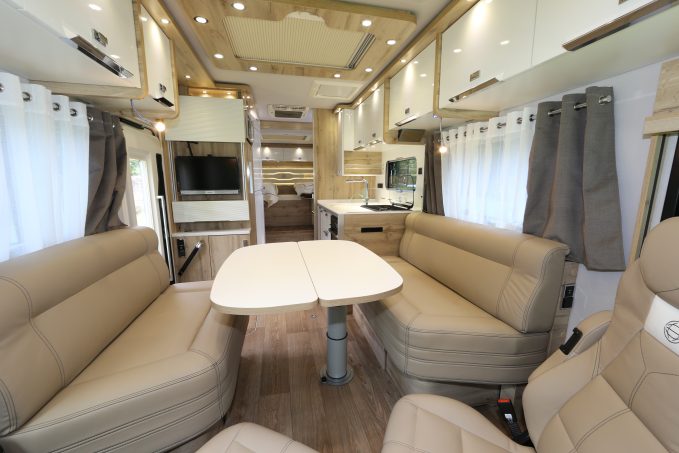 Un simple changement de teinte de bois peut vraiment générer une autre ambiance et donner l’impression que l’on se retrouve dans un tout nouveau véhicule. C’est ce que Le Voyageur a voulu montrer en présentant des modèles 2020 dont les intérieurs profitent du nouveau mobilier « Dune ». Celui-ci donne une nouvelle envergure aux magnifiques intégraux de la marque angevine. Les designers ont joué sur l’aspect massif de la boiserie en la combinant à des portes de placards blanc laqué. La combinaison est de toute beauté et donne une véritable impression d’espace.