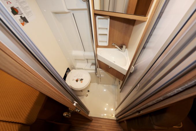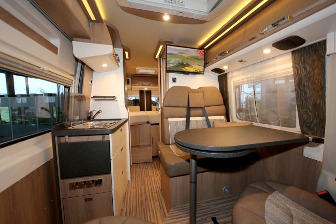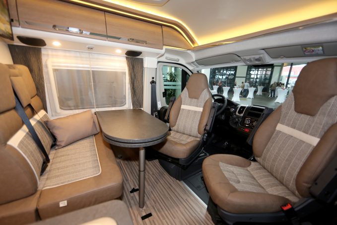 Le principal avantage d'un Charming Coupé est d'offrir un maximum d'espace du côté de la cabine, sans pour autant perdre trop de placards. Ces derniers restent toujours présents sur les côtés. Seule une petite niche subsiste dans le pavillon avant. Elle est harmonieusement rétro-éclairée par un ruban de leds. L'ensemble confère une ambiance agréable dans le salon et se marie parfaitement avec la belle finition intérieure.