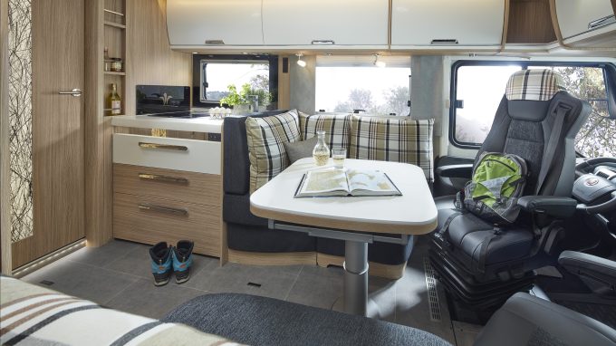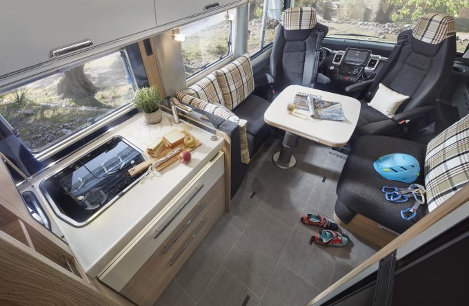 Dans le détail, la banquette de gauche dispose toujours d’un retour en L contre la cuisine, laquelle, à cette occasion, a été intégralement repensée avec des rangements plus volumineux. La circulation entre partie arrière et cellule devient plus aisée et la sensation d’espace plus importante.
