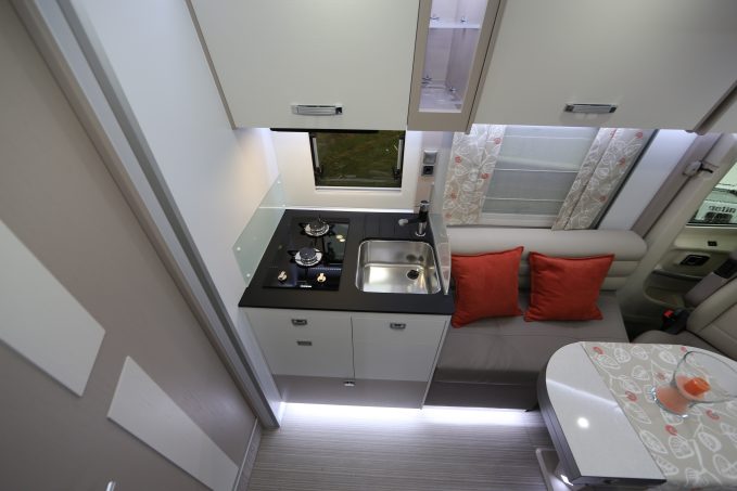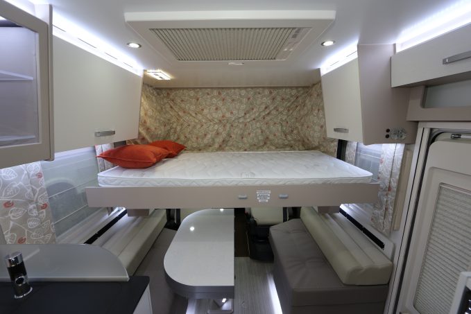 A l'intérieur, les i-Progress s'offrent une ligne de mobilier inédite. Tous les modèles embarquent un salon avec banquettes en vis à vis, comme sur le Rubi CF ci-dessus.