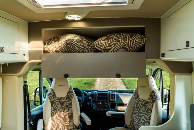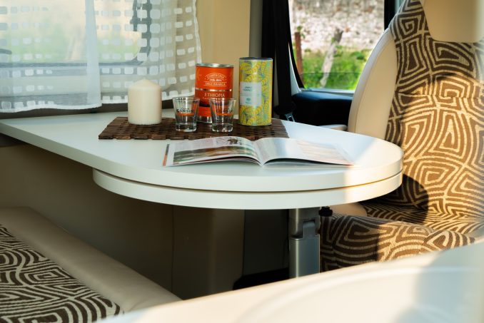 Homologué avec quatre places carte grise, ce modèle ne dispose en série que d'un lit transversal arrière biplace (196 x 126 cm). Un lit de pavillon peut être éventuellement ajouté en option mais modifie la forme de sa coiffe avant. Son style contemporain se marie plutôt bien avec la ligne du porteur transalpin. L'ambiance à bord peut être personnalisée à la convenance du client.