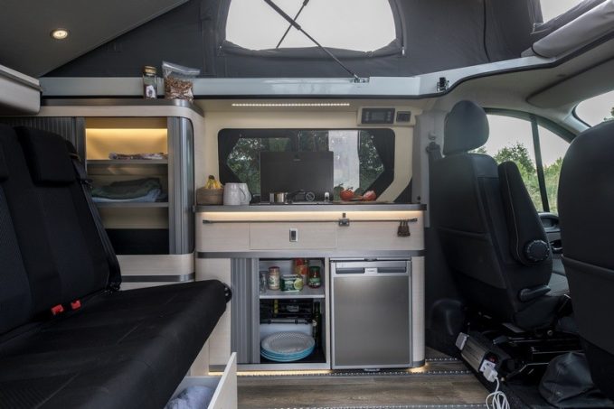 Pour ce qui est de l’intérieur de ces deux nouveaux modèles, on retrouve le même aménagement de série propre au Klubber à savoir un bloc cuisine avec évier, réchaud 2 feux, réfrigérateur de 39 l, table amovible et rangements. Pour la partie nuit, le toit levable cache un couchage de deux personnes et la banquette arrière est convertible en un grand lit.