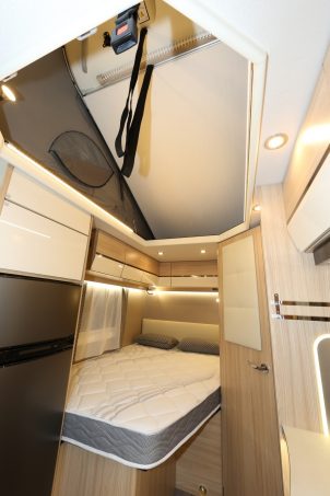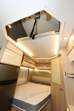 La marque vendéenne Florium aime se démarquer. Le salon de Düsseldorf a en effet reçu la visite d'un Baxter 64 LDF doté, en pavillon, d’un toit relevable. A l’instar des fourgons, cet équipement permet de loger deux autres personnes, en plus du couchage à la française choisi pour ce modèle. A l’étape, ce profilé peut ainsi prétendre accueillir 4 personnes pour la nuit, dans seulement 6,50 m de longueur. Baptisé Pop-Up, ce montage exclusivement réservé à ce modèle est disponible en option, moyennant 3 500 €. Sa mise en place est manuelle. Il faudra donc faire preuve de délicatesse au moment de replier l’ensemble, pour éviter tous pincements de la toile.