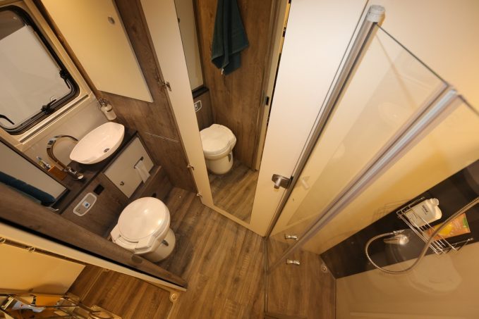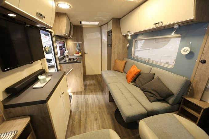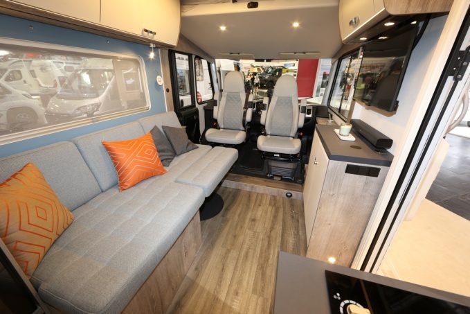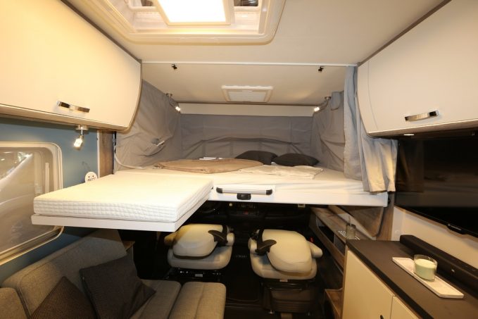 La zone de vie, pour sa part, s’axe prioritairement autour d’un grand salon matérialisé par une grande banquette latérale, profonde et confortable. En utilisant un intégral, Carado choisit donc le lit de cabine comme couchage principal. Ce dernier présente l’avantage de pouvoir être utilisé de deux manières : soit en transversal (un grand classique), soit en lits jumeaux grâce à des rallonges amovibles.
