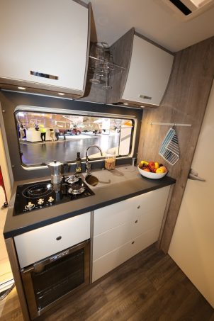 Ce ShowCar profite d’une belle cuisine droite, esthétique et néanmoins fonctionnelle. En termes d’innovation, la kitchenette intègre un réchaud 3 feux (2 gaz et 1 induction) ainsi qu’une multiprise 220 V et USB incorporée dans un rail extractible du plan de travail. Cette cuisine se distingue également par sa très grande baie ouvrante, qui permet d'y officier face à de superbes paysages.