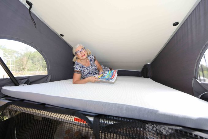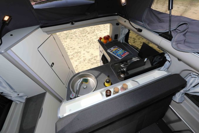Pour utiliser la cuisine, il y a nécessité de lever le toit sous lequel loge un vaste couchage très confortable, mais où la température peut monter très vite lorsque le mercure monte à l'extérieur. Trois aérations permettent heureusement de créer un courant d'air revivifiant.