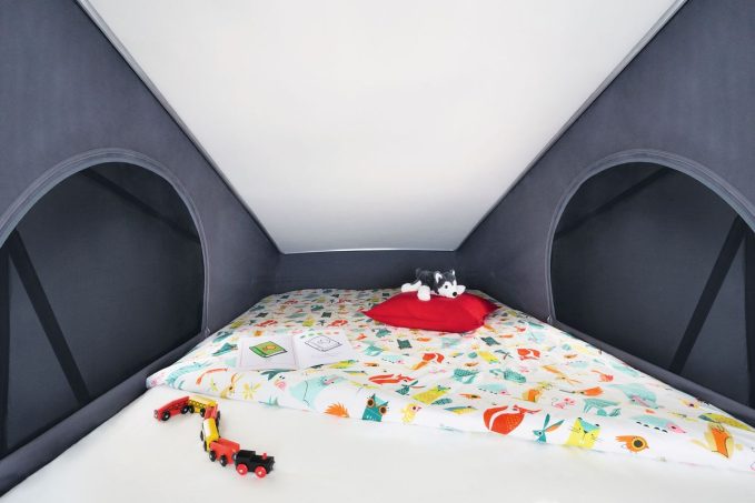 • Le couchage arrière transversal est secondé par celui dans le toit. © Camping-car Magazine