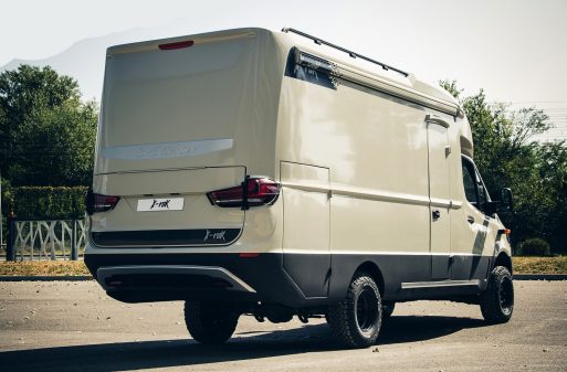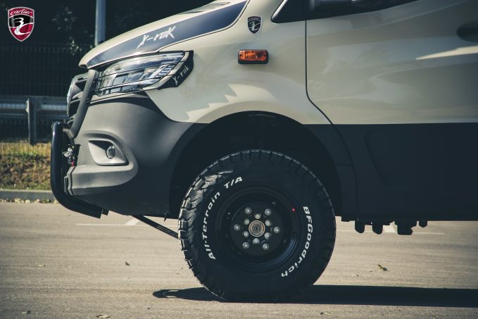 Sa structure monocoque autoportante en polyester, de 4,50 m de long (jusqu'à 5 m possible), 2,15 m de large et 2,97 m de haut, repose sur le châssis 4x4 du Mercedes Sprinter dernière génération avec motorisation V6 CDI de 190 ch et boîte automatique. Le véhicule a droit à des pneumatiques spéciaux BF Goodrich All Terrain et reçoit des grilles de protection ''maison'' sur l'ensemble de ses éclairages. En plus d'un solide pare-buffle, le bouclier avant dissimule un treuil électrique. Ce type d'accessoire se révèle indispensable pour se sortir des difficultés lorsqu'on évolue en terrains accidentés.