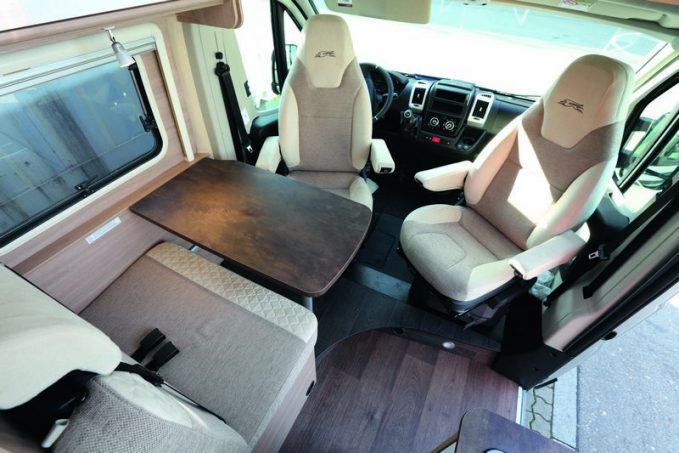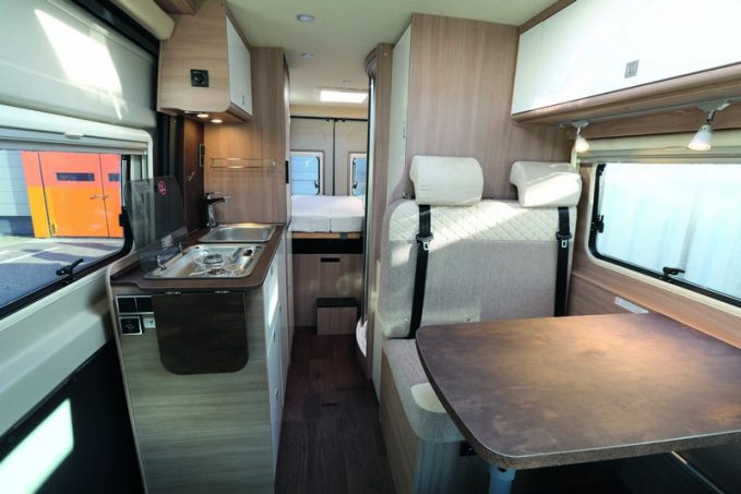 Ce micro-véhicule (5,41 m) dispose d’un salon étonnamment assez spacieux ! L’aménageur a opté pour un agencement classique avec une banquette face route et deux sièges de cabine pivotants. Ces assises encadrent la table, montée sur rail contre la paroi de gauche. Le bloc cuisine, également classique, se montre fonctionnelle. Le bloc se prolonge à l’aide d’une tablette rabattable qui sert de plan de travail. Le réfrigérateur est un petit modèle de 65 l. Si sa capacité peut sembler faible, elle conviendra toutefois parfaitement à un couple.
