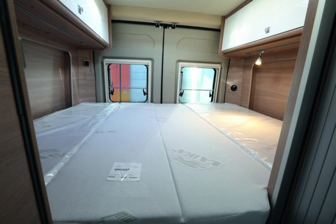 Ne cherchez pas plusieurs couchages à bord, il n’y en a qu’un, double, installé transversalement. Le matelas est en mousse de qualité. Il repose sur un sommier à lattes. Ce lit peut être en partie démonté pour libérer le couloir et autoriser ainsi le chargement d’objets encombrants comme des vélos, par exemple.