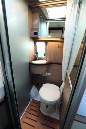 Le Kosmo Van 5.4 est bien fourni en équipement. Ce qui est appréciable pour un modèle d’accès. Le cabinet de toilette est un compartiment unique, qui peut être transformé en cabine de douche en tirant un rideau Nylon (on a vu mieux !) Bonne note en revanche pour le caillebotis qui recouvre le receveur de douche et permet de garder les pieds à peu près au sec. Le chauffage est un combiné de 6 000 W qui fonctionne au gasoil.