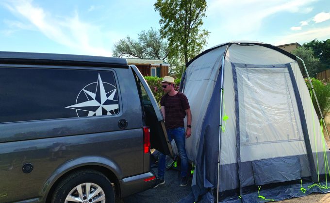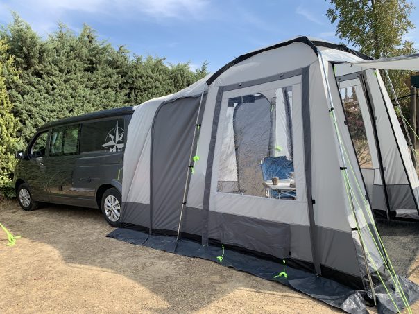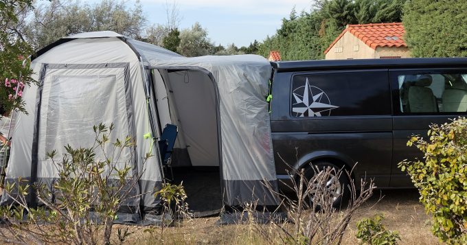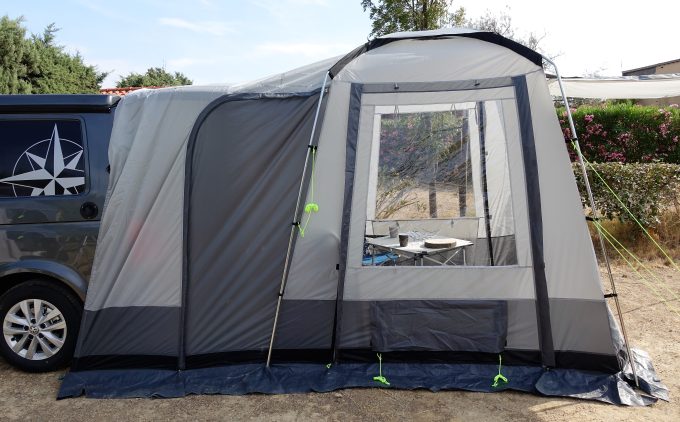 Cet auvent possède deux portes d’accès sur chaque côté du tunnel de raccordement. Façade et côtés reçoivent des fenêtres cristal équipées de rideaux intérieurs occultant. Haubanage et housse de rangement sont fournis de série. Le poids de l'ensemble, une fois replié, ne dépasse pas 13 kg et peut se ranger dans la soute de votre camping-car.