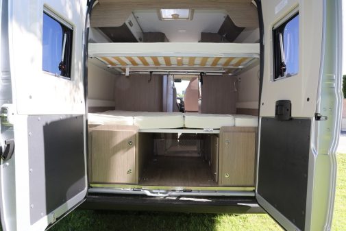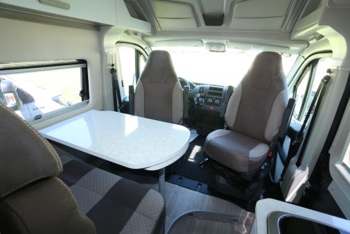 Le salon, pour sa part, se compose des sièges avant, montés sur embase pivotante, et d’une banquette face route pour deux personnes. A noter que cette dernière peut accueillir côte à côte, deux sièges enfants homologués. Le plateau de table est bien dimensionné et bénéficie, en prime, d’une rallonge pivotante dissimulée en dessous. L’ensemble peut, si besoin, être extrait du véhicule et accroché contre le bloc-cuisine pour un usage en extérieur. Ce poste dévoile par ailleurs un meuble droit dissimulant un tiroir pour couverts et deux autres s’apparentant à des casseroliers… mais dont le fond fait preuve de faible résistance avec un peu de poids. Côté équipement, la kitchenette profite d’un combiné réchaud deux feux et d’une cuve Inox, sans oublier le frigo attenant d’une capacité de 80 l (dont un freezer de 5 l).
