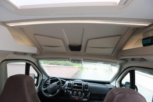 En partie avant, le Chausson V594 Max opère un changement radical avec l’apparition de la découpe de cabine. Cette ouverture offre une véritable aération, profitable aussi bien à l’étape que sur route. Avec 1,76m de hauteur maxi au-dessus de la tête, le conducteur n’est plus confiné dans son poste.