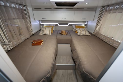 La salle d’eau se montre des plus pratiques avec sa cabine de douche indépendante et son double cloisonnement (porte battante de la cuisine et coulissante en chambre). Le montage de deux lits indépendants (205 x 80 cm côté douche et 200 x 80 cm côté WC) ne gène en rien la contenance de la soute (125 cm de haut avec accès facilité par deux portillons XXL). Cela permet même d’aménager deux grands tiroirs et une penderie en dessous de leurs sommiers à lattes. Même la marche centrale dissimule un rangement. Bien vu !