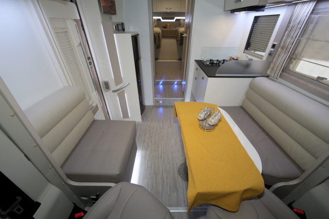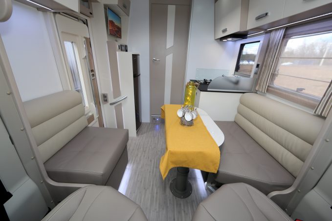 Pour pouvoir se retrouver à cinq convives, sièges cabine retournés, le salon du Malaga JF recourt à des banquettes en face à face, plus étroite côté porte de cellule que côté cuisine. Le bloc de cette dernière fait appel à un meuble droit (81 cm de large pour 68 cm de large). Il intègre un réchaud double feux (surmonté d'une hotte aspirante) et un évier carré (33 x 33 cm) recouvrable pour élargir le plan de travail. Absent de série, le lit de pavillon biplace reste commandable en option. Une troisième personne peut rester pour la nuit, en lui aménageant un couchage décent (215 x 98/66 cm) en dînette, une fois les banquettes reliées entre elles et en abaissant le plateau de table.