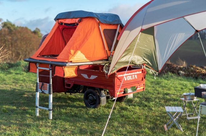 Le Volta Frog Camper se présente sous la forme d'un scooter à trois roues, type Piaggio Ape, doté d’un plateau arrière. Celui-ci accueille une tente de toit dépliable. Homologué pour circuler sur route, ce triporteur de 2,74 m de long affiche une charge utile de 525 kg. Sa propulsion est assurée par un moteur électrique, entraînant les roues arrière. Alimenté par une batterie de 4,3 kWh, il affiche une puissance de 2,5 kW (l’équivalent thermique de 3,4 ch) pour filer à 40 km/h sur une distance de 60 km.