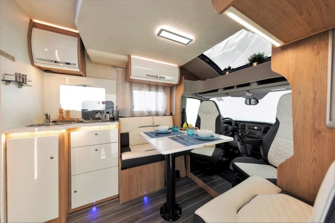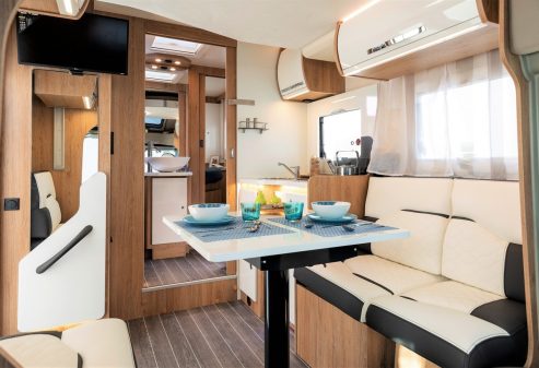 Cette implantation a connu son heure de gloire il y a un peu moins de 5 ans, mais l’offre s’est considérablement réduite au fur et à mesure des saisons. Au point de (quasiment) disparaître. C'était donc sans compter sur l'audace de CI de ressortir ce plan des cartons et de sérieusement le dépoussiérer. Le bureau d'études l'a modernisé par l'intégration de grandes tendances actuelles. A l’avant, le salon se pare des incontournables banquettes face-face, pour une meilleure optimisation de l’espace. Long de 7,45 m, ce Manoa 66 XT étonne par son habitacle spacieux et lumineux. Pour séduire encore plus, CI a souhaité contenir son prix à 52 490 €. Ce tarif inclut la motorisation 170 ch du Ford Transit, la caméra de recul, le panneau solaire 120W, la TV 19" avec antenne digitale ou encore le skyroof…