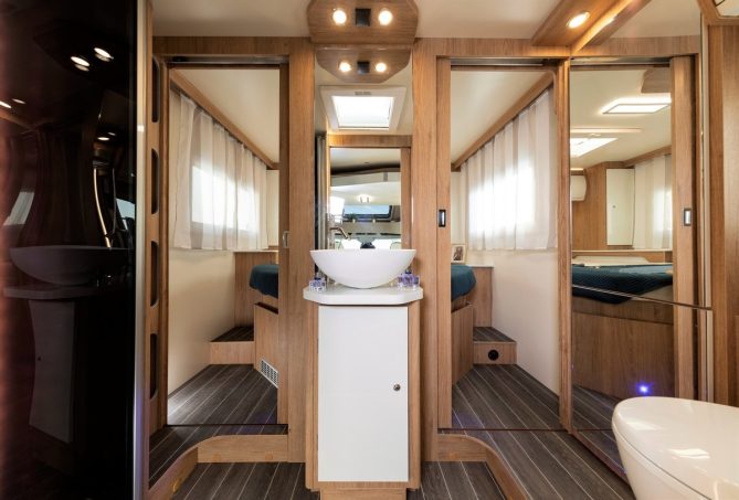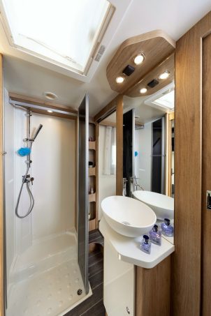 Pour rappel, cet espace sanitaire occupe toute la largeur du véhicule. Sur ce poste, la douche indépendante et le WC sont positionnés sur les flancs alors que la vasque trône fièrement au centre de ce poste. Elle partage une cloison commune avec le lit central logé derrière la paroi. L’accès à la chambre s’effectue donc de part et d’autre du lavabo.