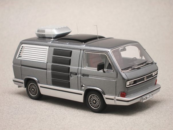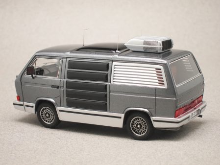 Cette miniature au 1/43e, réalisée par Avenue 43 (réf. 60015), reproduit au mieux l'étonnant fourgon VW doté d’une climatisation de toit, de baies latérales géantes et d’un skyroof central fixe offrant beaucoup de clarté à bord. La calandre intègre également quatre optiques carrées qui n’apparaîtront en série, sur certains modèles, qu’à partir de 1986.